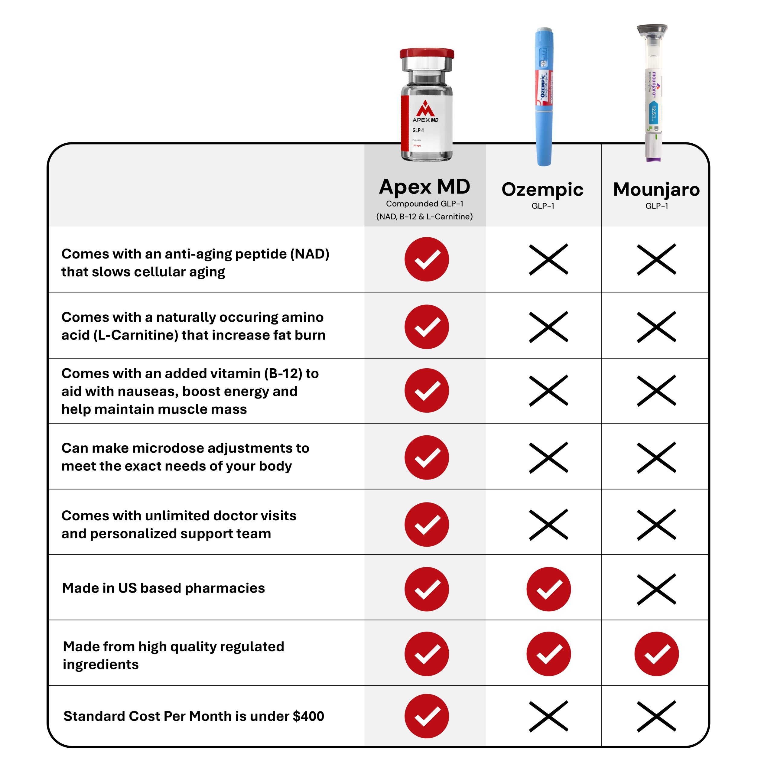 | Apex MD Compounded GLP-1 (NAD, B-12 & L-carnitine) | Ozempic GLP-1 | Mounjaro GLP-1 | |